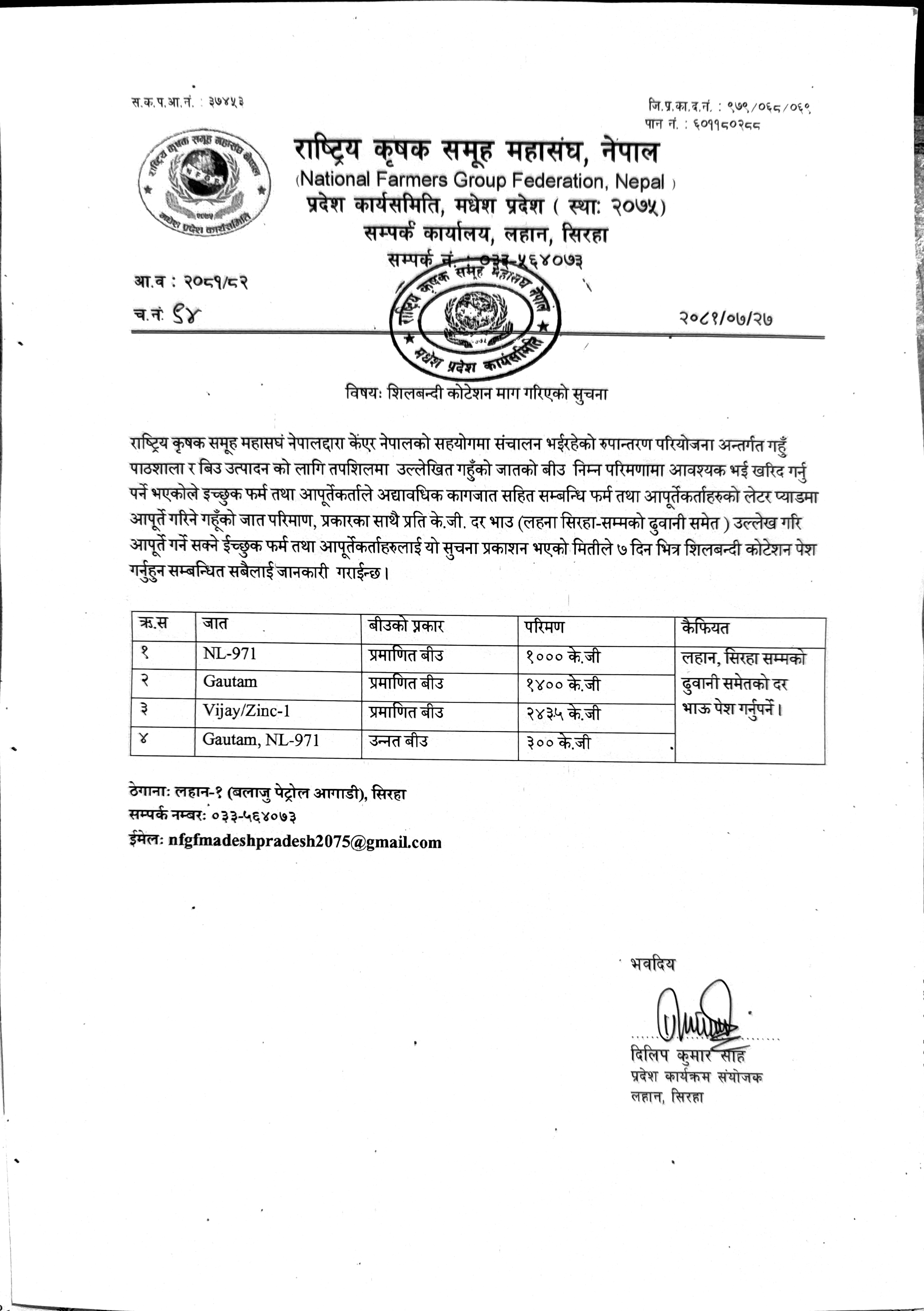 We express our heartfelt gratitude to the Karnali Provincial Government, Minister for Land Management, Agriculture and Cooperatives, Honorable Binod Kumar Shah, Agricultural Development Directorate, Birendranagar, Surkhet Tilak Prasad Pandey, Integrated Agriculture Laboratory, Birendranagar, Surkhet Yam Rana, Agriculture Branch Chief from Birendranagar Municipality and other teams for monitoring and interacting with the farmer identity card exercise including localization and classification o...