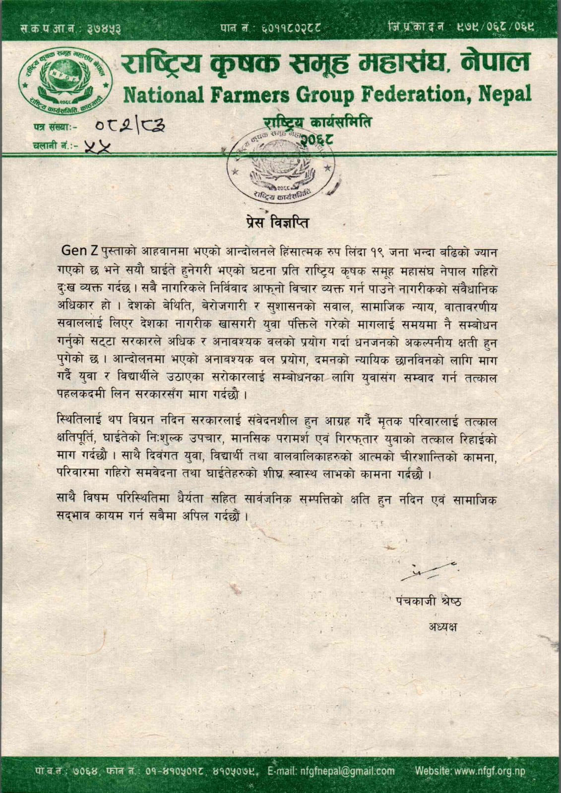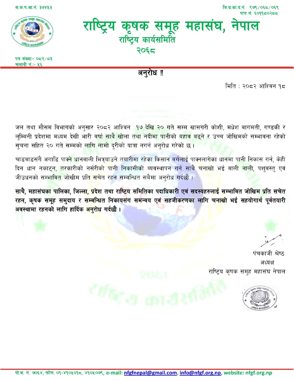 The 15th Foundation Day of the Federation was held on Bhadra 23, 2082 in Kathmandu under the chief hospitality of Director General Prakash Sanjel at the Department of Agriculture, with the special hospitality of Deputy Director General of the Department of Agriculture, Lalan Kumar Singh, with the guest participation of the FECOFUN, FEDWASUN, NFIWUAN, NACEUN, AFFON and other key representatives of civil society and the Federation's structures. The campaign was he...